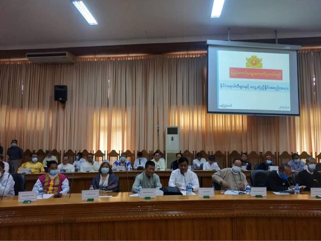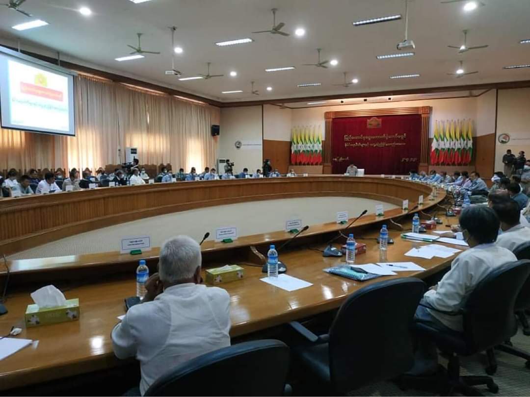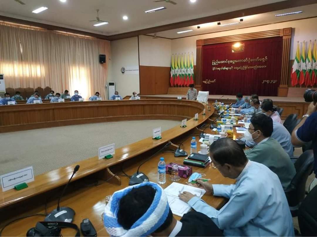 พรรคการเมืองหกสิบสองพรรคกำลังประชุมกับคณะกรรมการการเลือกตั้งที่ได้รับการแต่งตั้งโดยสภาทหารที่สำนักงานคณะกรรมการการเลือกตั้งสหภาพในกรุงเนปิดอว์ในวันที่ 21 พฤษภาคม Photo And Nwes Ayawady