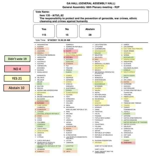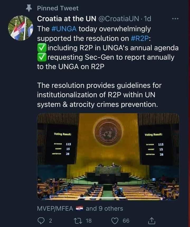 (၂၀/၅/၂၀၂၁)ပြီးခဲ့တဲ့ အင်္ဂါနေ့က ကုလသမဂ္ဂအထွေထွေညီလာခံမှာ မြန်မာနိုင်ငံအပေါ် စစ်လက်နက်နဲ့ နည်းပညာတွေရောင်းချတာမလုပ်ဖို့ တောင်းဆိုချက်ကို ဆွေးနွေးမဲခွဲဖို့ရှိခဲ့ပေမဲ့ အကန့်အသတ်မရှိရက်ရွှေ့ဆိုင်းခဲ့ရပါသည်။ ရွှေ့ဆိုင်းရခြင်းအဓိကအချက်ဟာ တရုတ်ကြောင့်လို့ပြောကြသလို အစ္စရေး ပါလက်စတိုင်းပြသနာကြောင့်လို ထင်ကြေးပေးတာတွေရှိခဲ့ပါတယ်။ တချို့ကလည်း လုံလောက်တဲ့ထောက်ခံမဲမရမှာစိုးလို့ရွှေ့ဆိုင်းတာလို့ခန့်မှန်းကြပါတယ်။ တကယ်ကတော့ အဲဒီထက်အရေးကြီးတဲ့ အဆိုနဲ့ တိုက်ဆိုင်နေခြင်းက အဓိက အချက်ပါပဲ။ အရေးကြီးတယ်ဆိုတဲ့အဆိုကတော့ ခရိုအေးရှားနိုင်ငံက တင်သွင်းတဲ့ ဒီကနေ့ မြန်မာပြည်သူတွေကြားရေပန်းစားနေတဲ့ R2P အဆိုပါ။ကုလသမဂ္ဂအထွေထွေညီလာခံမှာ R2P ကို အမြဲဆွေးနွေးနေရမဲ့ ခေါင်းစဉ်ထဲမှာ ထဲ့ဖို့။ အထွေထွေအတွင်းရေးမှူးချုပ်ကနေ နှစ်စဉ်ညီလာခံမှာ R2P အစီရင်ခံစာကို အဖွဲ့ဝင်နိုင်ငံတွေကိုတင်ပြဖို့။ ကုလသမဂ္ဂမှာ R2P နဲ့ပတ်သက်လို့ စနစ်တကျဖွဲ့စည်းဆောင်ရွက်မဲ့ ယန္တယားထူထောင်ဖို့ စတာတွေပါဝင်တဲ့ R2P အဆိုကို ဥရောပသမဂ္ဂထောက်ခံမှူနဲ့ ခရိုအေးရှားနိုင်ငံကဦးဆောင်အဆိုတင်သွင်းခဲ့တာပါ။အဆိုကို ကျန်အဖွဲ့ဝင်နိုင်ငံတွေက (၂) ရက်ကြာဆွေးနွေးပြီး မဲခွဲရာမှာ ထောက်ခံမဲ (၁၁၅) မဲ ကန့်ကွက်မဲ (၁၅) မဲ ပျက်ကွက်မဲ (၂၈) မဲနဲ့ R2P ဆုံးဖြတ်ချက် (A/75/L.82) ကို အတည်ပြုနိုင်ခဲ့ပါတယ်။ အဖွဲ့ဝင်နိုင်ငံအများစုထောက်ခံမှုနဲ့ အတည်ပြိုနိုင်ခဲ့တဲ့ သမိုင်းဝင်ဆုံးဖြတ်ချက်လို့တင်စားကြပါတယ်။ မြန်မာ့နွေဦးတော်လှန်ရေးကို အာဏာသိမ်းစစ်ကောင်စီက အကြမ်းဖက်သတ်ဖြတ်ချိန်ကစပြီး R2P ဆိုတဲ့အသံဟာ မြန်မာမှာရော ကမ္ဘာမှာပါ ပွက်လောရိုက်နေခဲ့တာပါ။ ဒါပေမဲ့ ကုလသမ္မဂညီလာခံမှာ အဖွဲ့ဝင်နိုင်ငံတွေက R2P ခေါင်းစဉ်နဲ့ တရားဝင်ထဲ့သွင်းဆွေးနွေးဖို့ အဆင်မပြေခဲ့ပါဘူး။ တရားဝင်သဘောတူထားကြတဲ့ ဆွေးနွေးပွဲခေါင်းစဉ်မှာ မပါလို့ဖြစ်ပါတယ်။ အခုလို ခရိုအေးရှားရဲ့အဆိုကို သဘောတူဆုံးဖြတ်ပြီးပြီဖြစ်လို့ R2P ခေါင်းစဉ်နဲ့ဆွေးနွေးမှုတွေမကြာခင်ကြားရ မြင်ရဖို့တွေရှိလာပါပြီ။ ဒီအဆိုတင်သွင်းဆုံးဖြတ်နိုင်ဖို့ ညှိနိုင်းရတာကို (၂)လကြာအချိန်ယူခဲ့ရတယ်လို့ ခရိုအေးရှားကပြောထားပါတယ်။ အဆိုတစ်ခု တင်သွင်းဖို့နဲ့ ဆုံးဖြတ်ချက်ကျဖို့တောင် အချိန်ယူရတယ်ဆိုရင် လက်တွေ့ကိုင်တွယ်နိုင်ဖို့ဆိုရင် အချိန်တွေပိုယူကြရမယ်ဆိုတာ နားလည်နိုင်ကြမယ်ထင်ပါတယ်။ ကုလသမဂ္ဂအထွေထွေညီလာခံရဲ့ R2P ဆုံးဖြတ်ချက်အမှတ် (A/75/L.82) ဟာ မြန်မာနိုင်ငံက နွေဦးတော်လှန်ရေးမှာ အသက်ပေးခဲ့ရတဲ့ သူရဲကောင်းပြည်သူတွေရဲ့ အသက်သွေးချွေး ပေးဆပ်မှုတွေကနေ ထွက်ပေါ်လာတဲ့ရလာဒ်တစ်ခုလို့တောင်ပြောနိုင်ပါတယ်။ အရွေ့တ