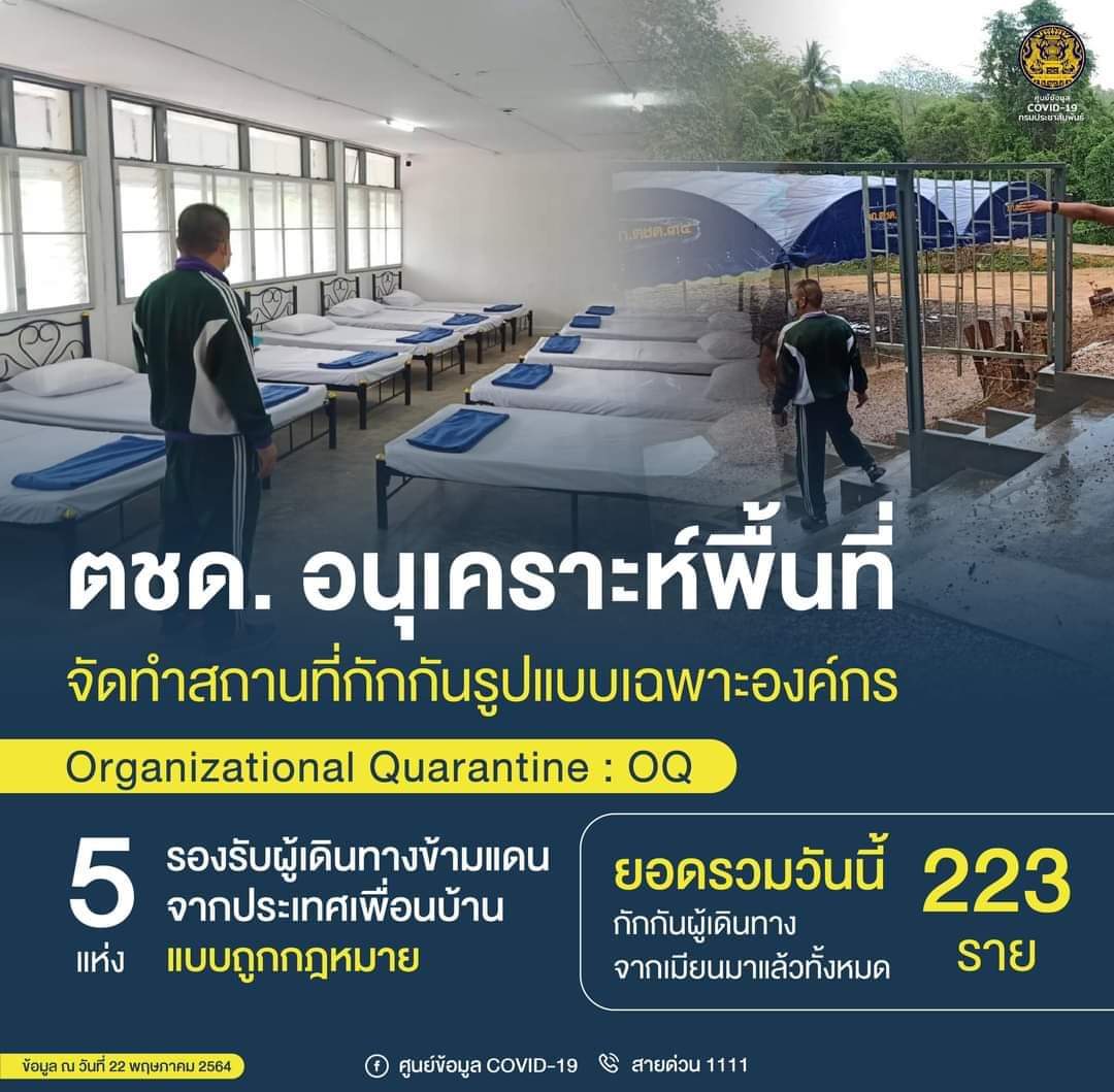 สำนักงานตำรวจแห่งชาติ โดย กองบัญชาการตำรวจตระเวนชายแดน (ตชด.) จัดทำสถานที่กักกันรูปแบบเฉพาะองค์กร (Organizational Quarantine : OQ) 5 แห่ง รองรับผู้เดินทางข้ามแดนจากประเทศเพื่อนบ้านแบบถูกกฎหมาย โดยยอดรวมวันนี้ ใช้กักตัวผู้เดินทางจากเมียนมาแล้วทั้งหมด 223 ราย เป็นชาย 151 ราย และหญิง 72 ราย รวมถึงกำลังจะเปิดเพิ่มอีกหลายแห่งทั่วประเทศ