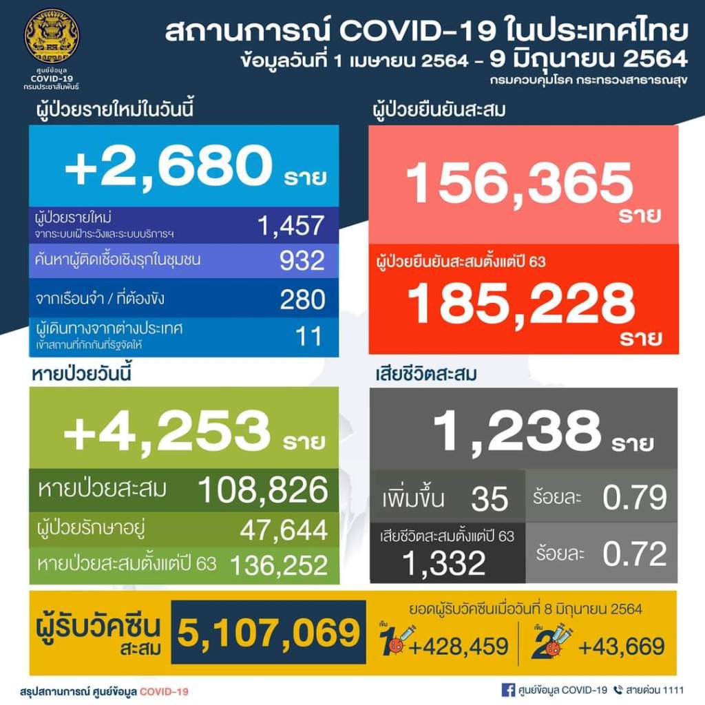 The COVID-19 Information Center reports the situation of Covid-19 as of June 9, 2021 at 7:30 a.m. Thailand found 2,680 confirmed cases today, of which 280 were from prisons.