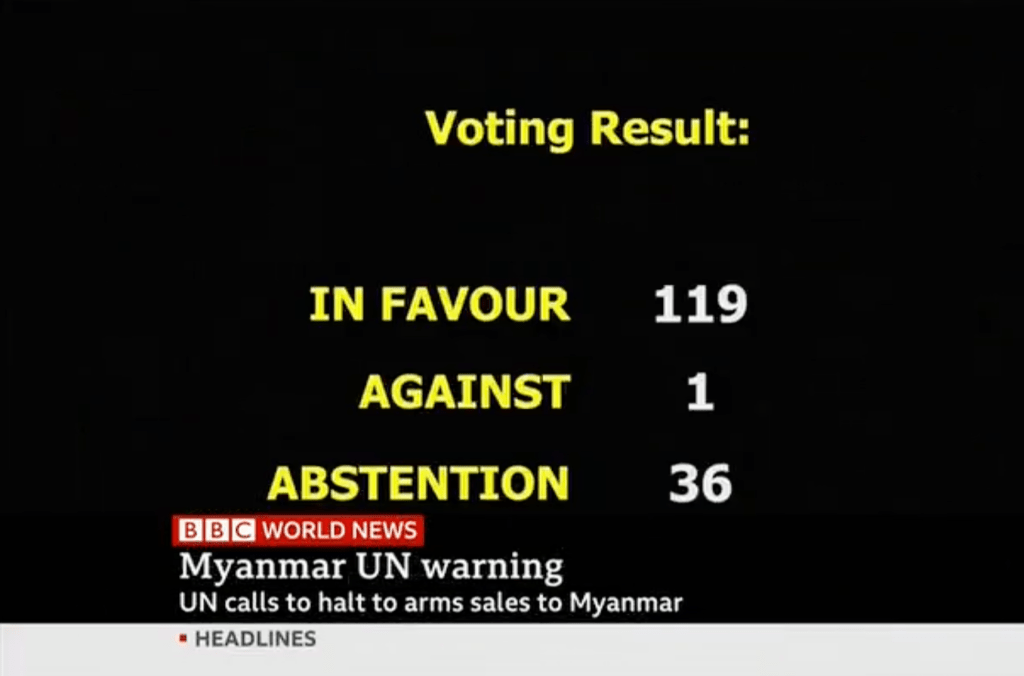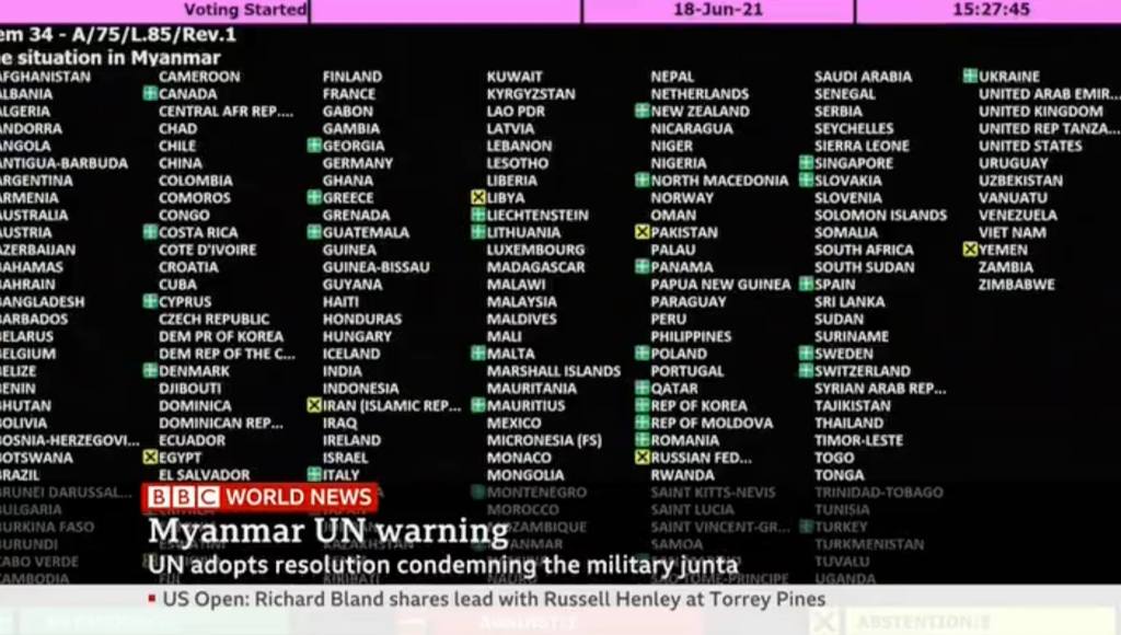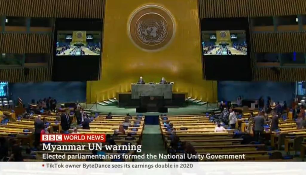 ကုလသမဂ္ဂအထွေထွေညီလာခံတွင် ကမ္ဘာတစ်ဝှမ်းရှိနိုင်ငံပေါင်း ၁၁၉ နိုင်ငံများမှ၊ နိုင်ငံတော်၏ အတိုင်ပင်ခံပုဂ္ဂိုလ်ဒေါ်အောင်ဆန်းစုကြည်၊ သမ္မတကြီးဦးဝင်းမြင့် အပါအဝင် မတရားဖမ်းဆီးထိန်းသိမ်း ခံထားရသည့် နိုင်ငံရေးအကျဥ်းသားများကို ခြွင်းချက်မရှိချက်ခြင်းလွှတ်ပေးရန် တောင်းဆိုခြင်း၊ ၂၀၂၀ ခုနှစ်၊ နိုဝင်ဘာလ ၈ရက် နေ့တွင်ကျင်းပခဲ့သောလွတ်လပ်ပြီးတရားမျှတသော အထွေထွေရွေးကောက်ပွဲ ၏ရလဒ်များကိုလေးစားခြင်းအားဖြင့် မြန်မာပြည်သူလူထု၏ ဒီမိုကရေစီဆန္ဒကို လေးစားလိုက်နာရန် တောင်းဆိုခြင်း၊ အာဏာသိမ်းစစ်ကောင်စီ၏ လက်ထဲသို့စစ်လက်နက်များ စီးဆင်းမှုကိုရပ်တန့်ရန် တောင်းဆိုခြင်း စသည့်ဆုံးဖြတ်ချက်များကို အတည်ပြုခြင်းအားဖြင့် မြန်မာနိုင်ငံရှိရက်စက် ကြမ်းကြုတ် သော အာဏာသိမ်းစစ်ကောင်စီအား သတိပေးလိုက်ကြသည်။ ရက်စက်ကြမ်းကြုတ်ပြီး ကျရှုံးနေပြီဖြစ်သောအာဏာသိမ်းစစ်ခေါင်းဆောင်များသည် သူတို့၏အကြမ်း ဖက်မှုလုပ်ရပ်များကို ချက်ချင်းအဆုံးသတ်ရန်အတွက် ၁၁၉ နိုင်ငံနှင့် နိုင်ငံတကာအသိုင်းအဝိုင်း ၏ စကားကိုနားထောင်ရန်နှင့် အချုပ်အခြာအာဏာကို မြန်မာပြည်သူများနှင့် ၎င်းတို့ ရွေးကောက်ထားသော အမျိုးသားညီညွတ်ရေးအစိုးရထံသို့ ခြွင်းချက်မရှိ ချက်ချင်းပြန်လည်အပ်နှင်းရန် နောက်ဆုံးသတိပေး အခွင့်အရေးပေးနေပါသည်။