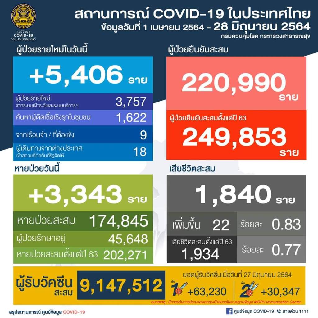 Found the number of people infected with COVID-19 5,406 new cases, divided into 5,397 new infections, from prisons to incarceration, 9 and 22 additional deaths, bringing the cumulative number of infections during the new wave of infections from April 2021 from April 1 to 28. In June 2021, there are 220,990 cases and 1,840 cumulative deaths, while the cumulative number of infections since the outbreak began in early 2020 is 249,853, and the cumulative death toll is 1,934, making Thailand the number of confirmed confirmed cases in Thailand. 76 of the world