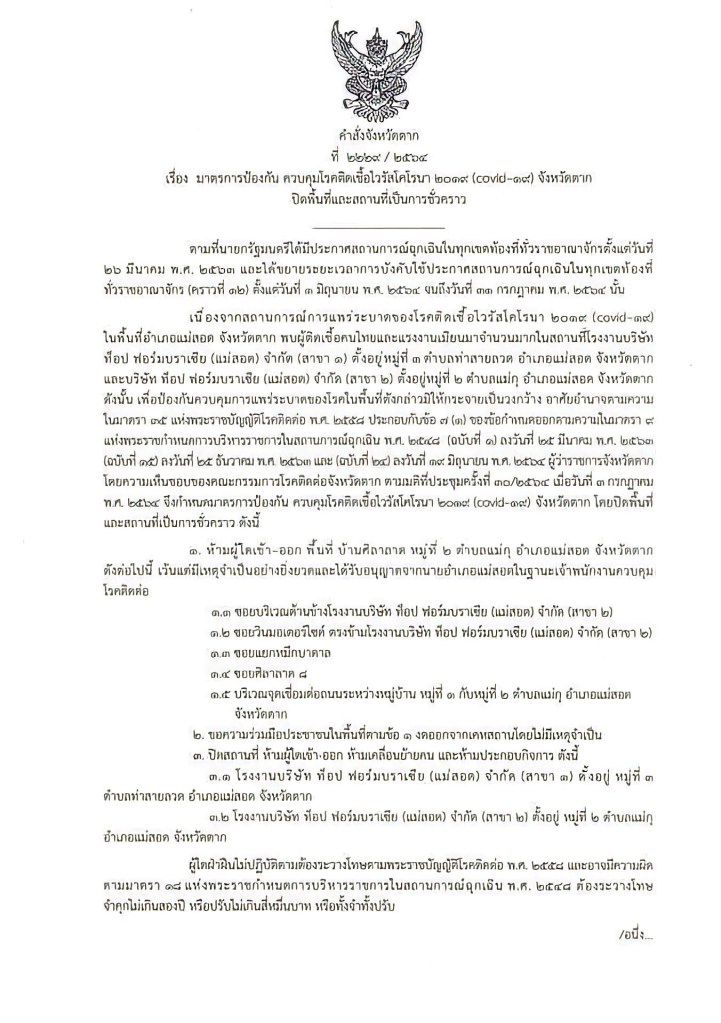 Due to the epidemic situation of corona virus 2009 (cond-net) in Mae Sot district, Tak province, many Thai and Myanmar workers have been infected at the factory of Top Form Brasserie (Mae Sot). Co., Ltd. (Branch 2) located at Village No. 6, Tha Sai Luat Subdistrict, Mae Sot District, Tak Province, and Top Form Brassiere (Mae Sot) Co., Ltd. (Branch 2) located at Village No. 6, Mae Ku Subdistrict, Mae Sot District, Tak Province. Control the spread of disease in such areas to spread widely. By virtue of Section 5 of the Communicable Disease Act B.E. of the Emergency Decree on Public Administration in Emergency Situations B.E. 2558 (No. 2) dated 25 March B.E. (No. 15 dated 25 December B.E. 2560 and (No. 24 dated 19 June B.E. 2011, Governor of Tak Province with the approval of the Communicable Disease Committee of Tak Province According to the resolution of the meeting No. 30/2021 on July 3, 2011, measures to prevent and control some (Covd-on) coronavirus infection in Tak Province by temporarily closing the team that unpack the place are as follows: