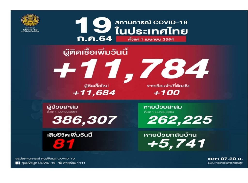 ကျန်းမာရေး၀န်ကြီးဌာန မှ ယနေ့နံနက်အတည်ပြုချက်အရထိုင်းနိုင်ငံတွင် ကိုဗစ်ကူးစက်ခံရသူ ၁၁,၇၈၄ ဦး၊ သေဆုံးသူ ၈၁ ဦး နှင့် ၅၇,၄၁ ဦး တို့ပြန်လည်သက်သာလာသည်ဟုပြောကြားသည်။