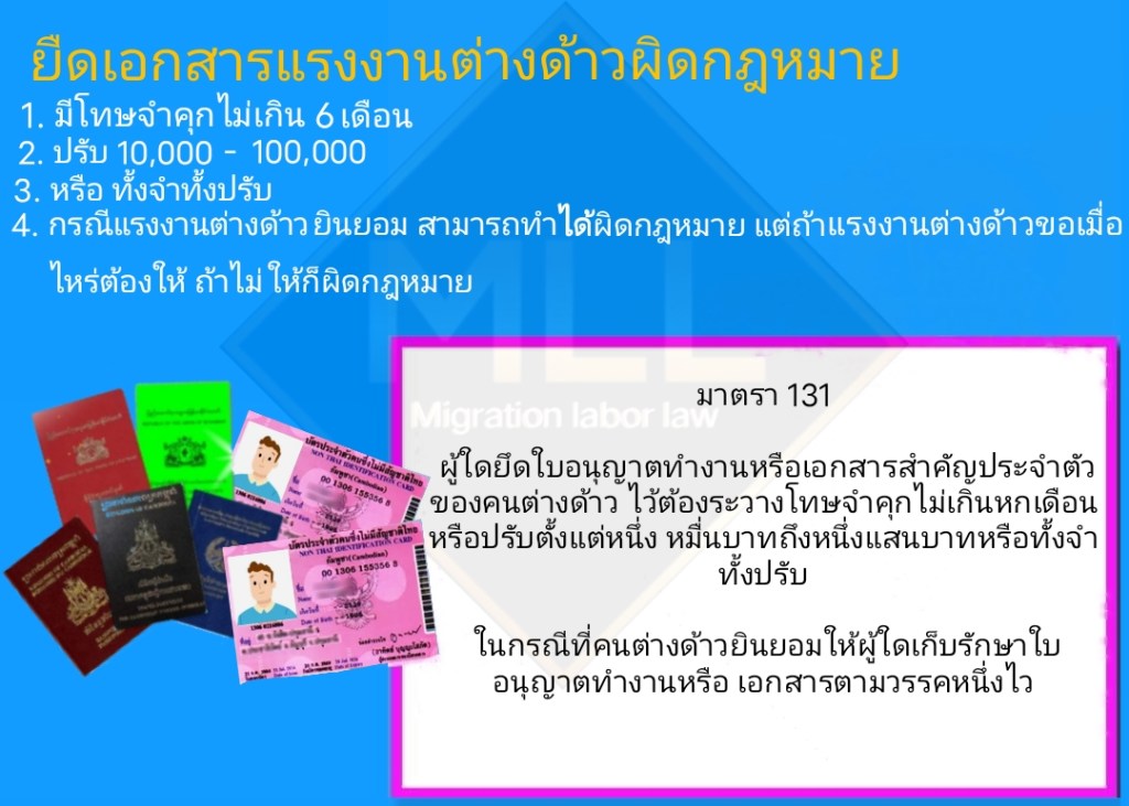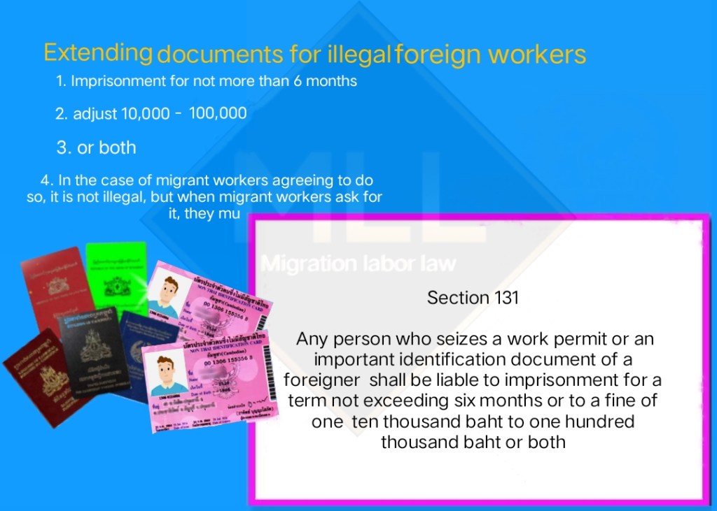 Any person who seizes a work permit or an important identification document of a foreigner shall be liable to imprisonment for a term not exceeding six months or to a fine of one ten thousand baht to one hundred thousand baht or both
