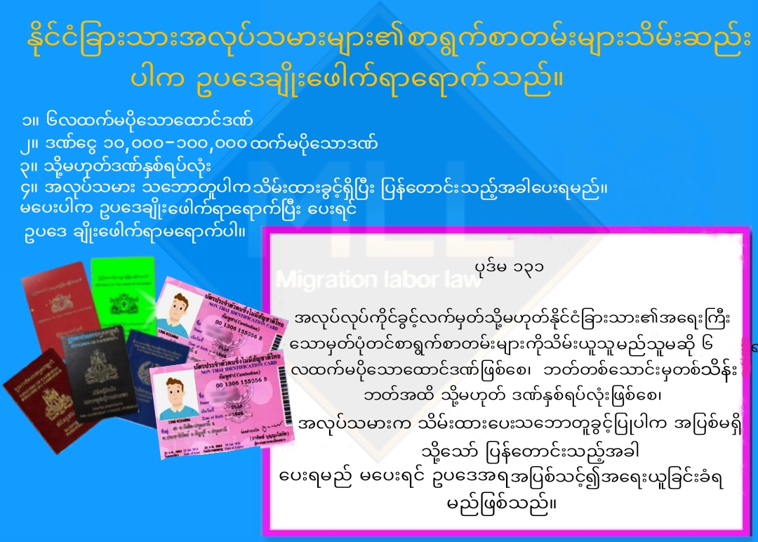 In the case where an alien agrees to allow any person to keep a work permit or The documents under paragraph one must give consent and facilitate them. Aliens can access such documents at any time according to people. Foreigners requesting violations will be liable to the same penalties as those for violations. in violation of paragraph one