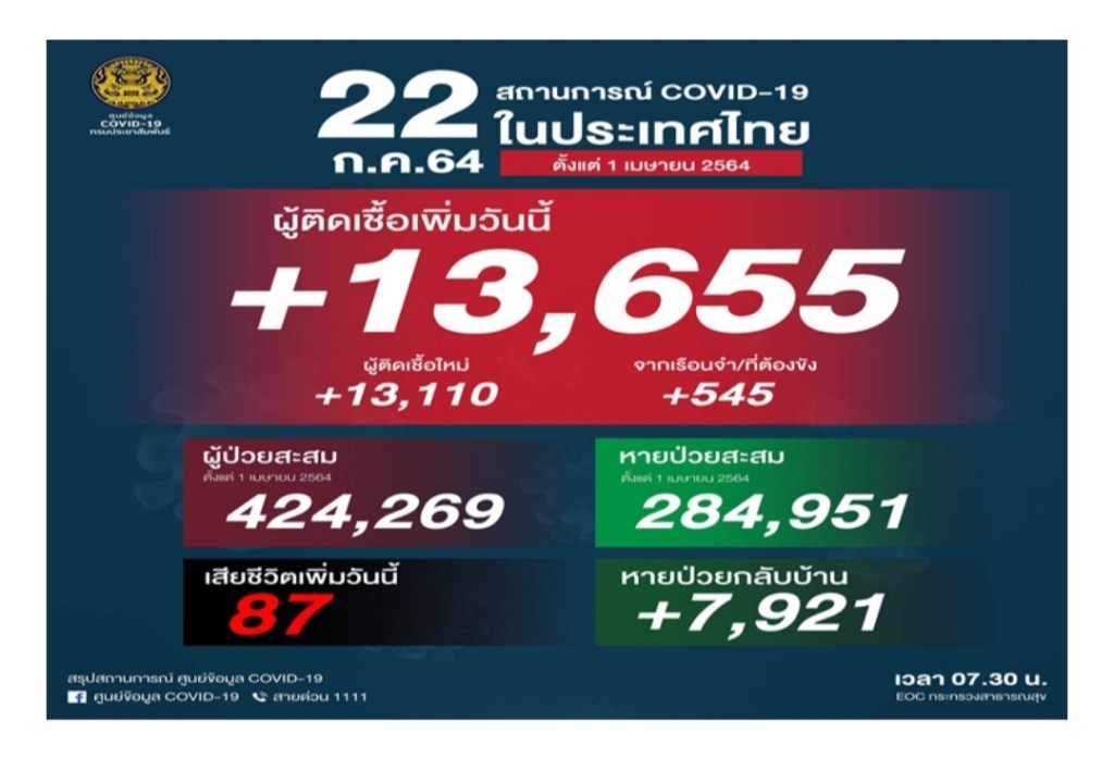 ကျန်းမာရေး၀န်ကြီးဌာန မှ ယနေ့နံနက်အတည်ပြုချက်အရထိုင်းနိုင်ငံတွင် ကိုဗစ်ကူးစက်ခံရသူ ၁၃,၆၅၅ ဦး၊ သေဆုံးသူ ၈၇ ဦး နှင့် ၇,၉၂၁ ဦး တို့ပြန်လည်သက်သာလာသည်ဟုပြောကြားသည်။