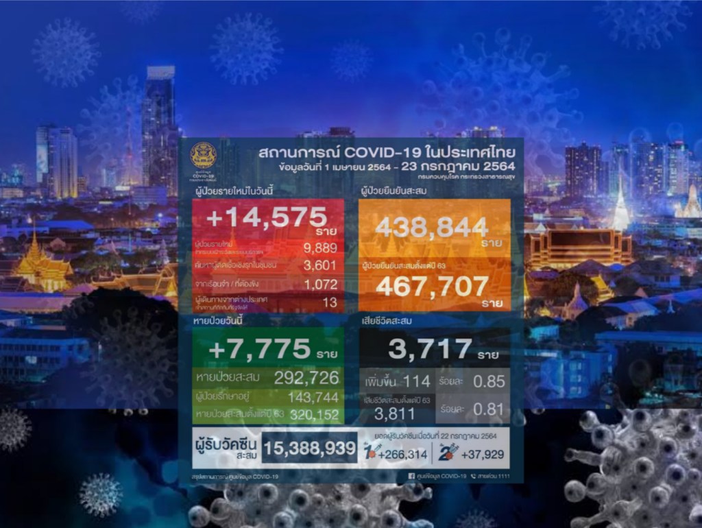 ကျန်းမာရေး၀န်ကြီးဌာန မှ ယနေ့နံနက်အတည်ပြုချက်အရထိုင်းနိုင်ငံတွင် ကိုဗစ်ကူးစက်ခံရသူ ၁၄,၅၇၅ ဦး၊ သေဆုံးသူ ၁၁၄ ဦး နှင့် ၇,၇၇၅ ဦး တို့ပြန်လည်သက်သာလာသည်ဟုပြောကြားသည်။