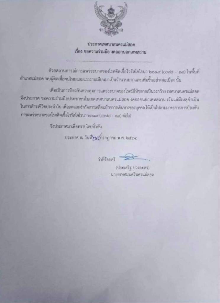 တာခ်ခရိုင် မဲဆောက်မြို့နယ်တွင် coronavirus 2019 (covid – 19) ကူးစက်ရောဂါဖြစ်ပွားမှုသည် ထိုင်းနှင့်မြန်မာရွှေ့ပြောင်းအလုပ်သမားအကြားကူးစက်မှုနှုန်းမြှင့်တက်