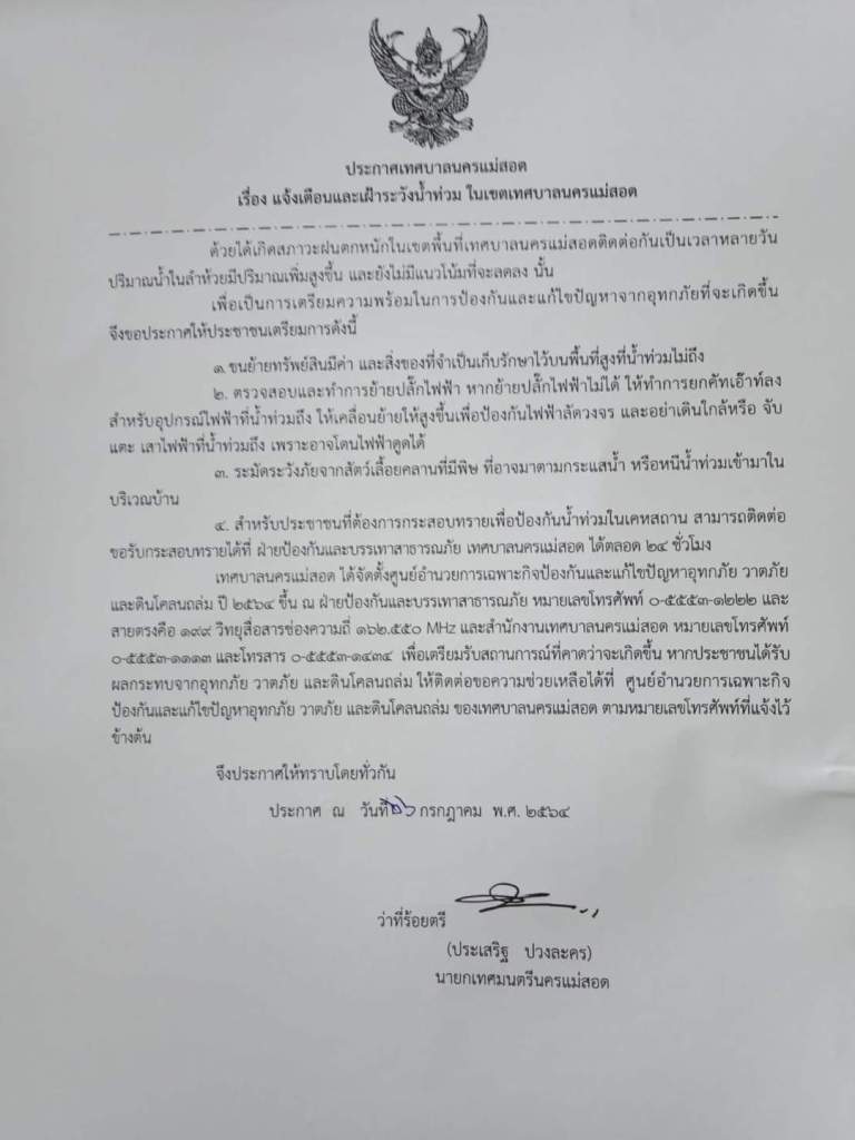 เรื่อง แจ้งเตือนและเฝ้าระวังน้ำท่วม ในเขตเทศบาลนครแม่สอด