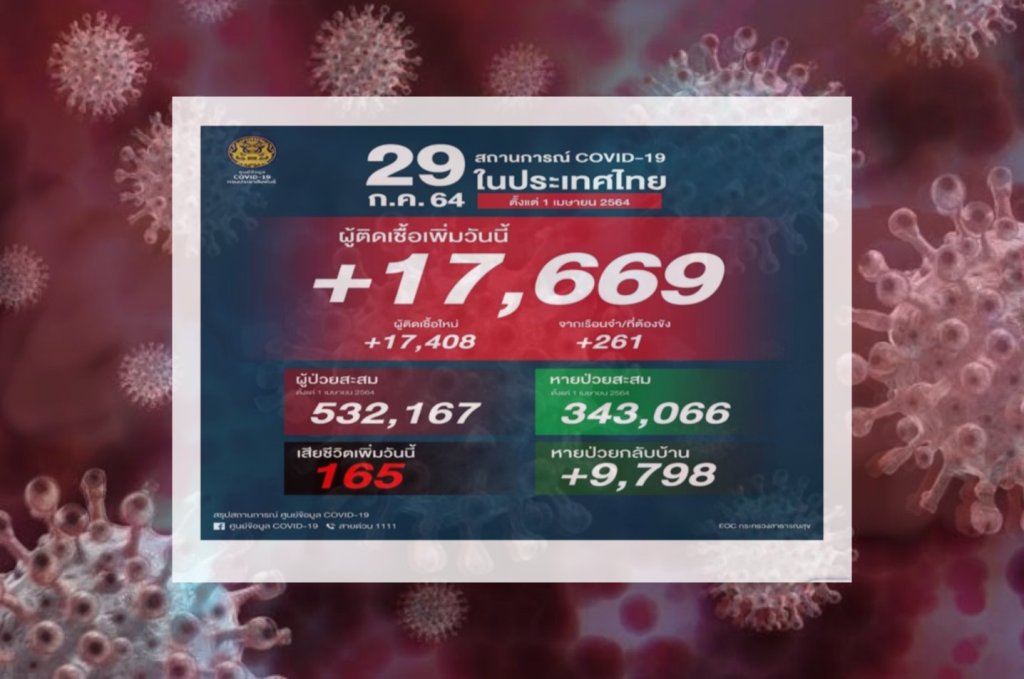 ကျန်းမာရေး၀န်ကြီးဌာန မှ ယနေ့နံနက်အတည်ပြုချက်အရထိုင်းနိုင်ငံတွင် ကိုဗစ်ကူးစက်ခံရသူ ၁၇,၆၆၉ ဦး၊ သေဆုံးသူ ၁၆၅ ဦး နှင့် ၉,၇၉၈ ဦး တို့ပြန်လည်သက်သာလာသည်ဟုပြောကြားသည်။