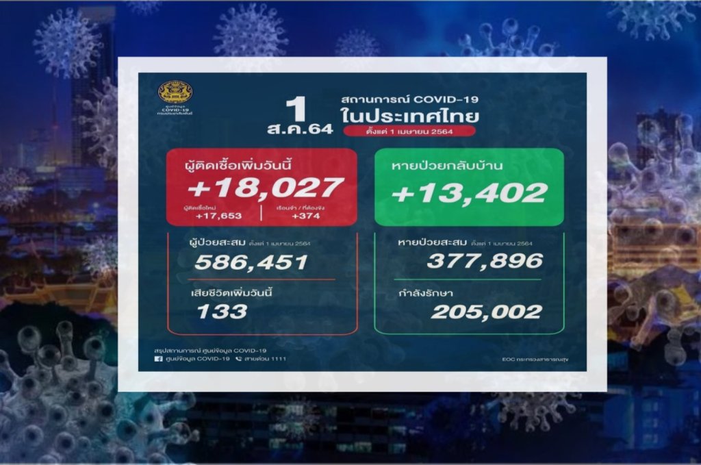 ကျန်းမာရေး၀န်ကြီးဌာန မှ ယနေ့နံနက်အတည်ပြုချက်အရထိုင်းနိုင်ငံတွင် ကိုဗစ်ကူးစက်ခံရသူ ၁၈,၀၂၇ ဦး၊ သေဆုံးသူ ၁၃၃ ဦး နှင့် ၁၃,၄၀၂ ဦး တို့ပြန်လည်သက်သာလာသည်ဟုပြောကြားသည်။