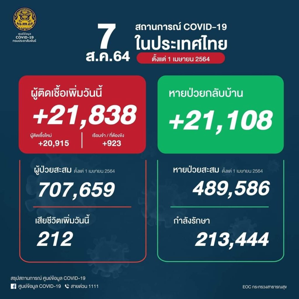 ကျန်းမာရေး၀န်ကြီးဌာန မှ ယနေ့နံနက်အတည်ပြုချက်အရထိုင်းနိုင်ငံတွင် ကိုဗစ်ကူးစက်ခံရသူ ၂၁,၈၃၈ ဦး၊ သေဆုံးသူ ၂၁၂ ဦး နှင့် ၂၁,၁၀၈ ဦး တို့ပြန်လည်သက်သာလာသည်ဟုပြောကြားသည်။