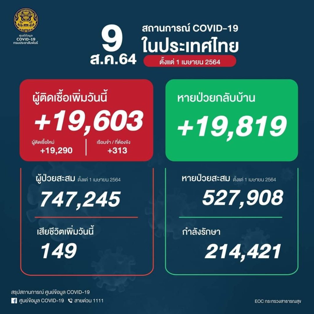 ကျန်းမာရေး၀န်ကြီးဌာန မှ ယနေ့နံနက်အတည်ပြုချက်အရထိုင်းနိုင်ငံတွင် ကိုဗစ်ကူးစက်ခံရသူ ၁၉,၆၀၃၊ ဦး၊ သေဆုံးသူ ၁၄၉ ဦး နှင့် ၁၉,၈၁၉ ဦး တို့ပြန်လည်သက်သာလာသည်ဟုပြောကြားသည်။