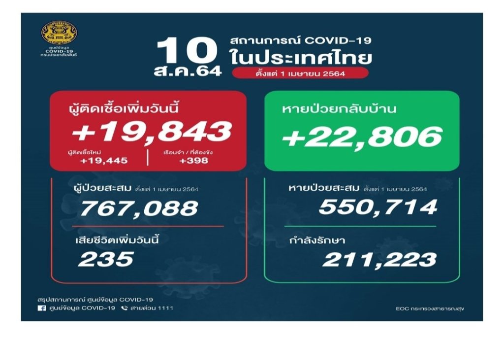 ကျန်းမာရေး၀န်ကြီးဌာန မှ ယနေ့နံနက်အတည်ပြုချက်အရထိုင်းနိုင်ငံတွင် ကိုဗစ်ကူးစက်ခံရသူ ၁၉,၈၄၃၊ ဦး၊ သေဆုံးသူ ၂၃၅ ဦး နှင့် ၂၂,၈၀၆ ဦး တို့ပြန်လည်သက်သာလာသည်ဟုပြောကြားသည်။