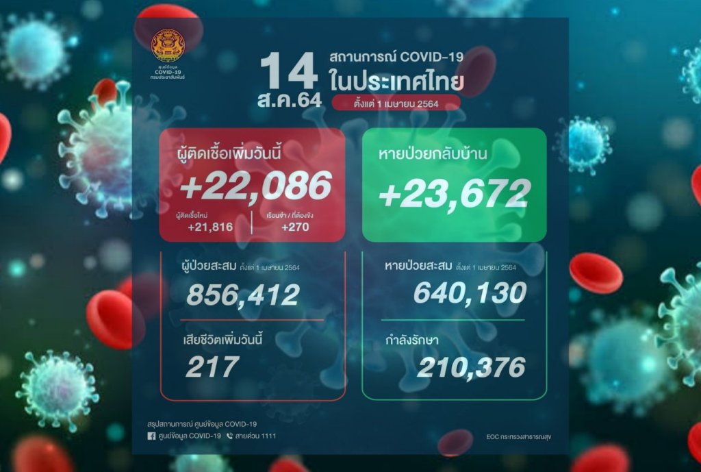 ကျန်းမာရေး၀န်ကြီးဌာန မှ ယနေ့နံနက်အတည်ပြုချက်အရထိုင်းနိုင်ငံတွင် ကိုဗစ်ကူးစက်ခံရသူ ၂၂,၀၈၆ ဦး၊ သေဆုံးသူ ၂၁၇ ဦး နှင့် ၂၃,၆၇၂ ဦး တို့ပြန်လည်သက်သာလာသည်ဟုပြောကြားသည်။