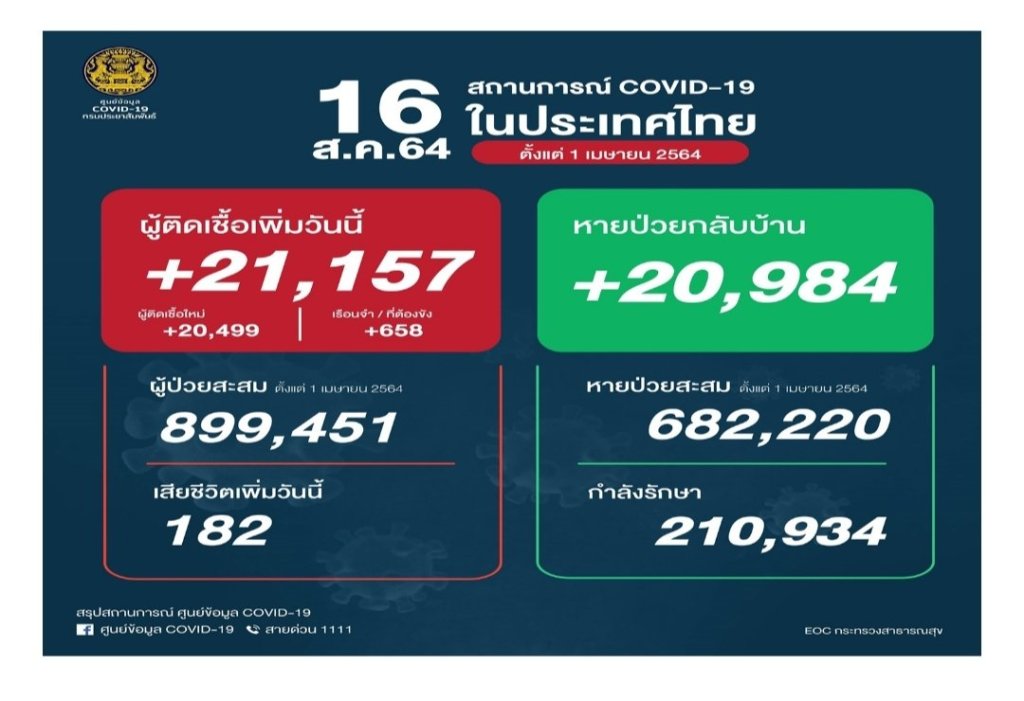 ကျန်းမာရေး၀န်ကြီးဌာန မှ ယနေ့နံနက်အတည်ပြုချက်အရထိုင်းနိုင်ငံတွင် ကိုဗစ်ကူးစက်ခံရသူ ၂၁,၁၅၇ ဦး၊ သေဆုံးသူ ၁၈၂ ဦး နှင့် ၂၀,၉၈၄ ဦး တို့ပြန်လည်သက်သာလာသည်ဟုပြောကြားသည်။
