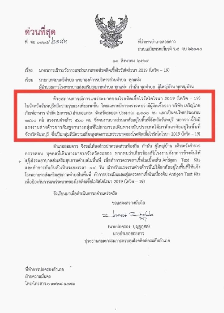 ထို့ကြောင့် Chanthaburi ခရိုင်မှ Rayong ခရိုင်သို့ အသွားအပြန် အ၀င်အထွက် သွားလာသည့်ပြည်သူများကိုစောင့်ကြည့်စစ်ဆေးရန်အတွက် ဗဟိုကျန်းမာရေးနှင့် ကူးစက်ရောဂါကာကွယ်တားဆီးရေးဌာနမှ ဒေသခံအုပ်ချုပ်ရေးအဖွဲ့အစည်းများ၊ ကျေးရွာအကြီးအကဲများအားအထူးအသိပေးတောင်းဆိုထားသည်။