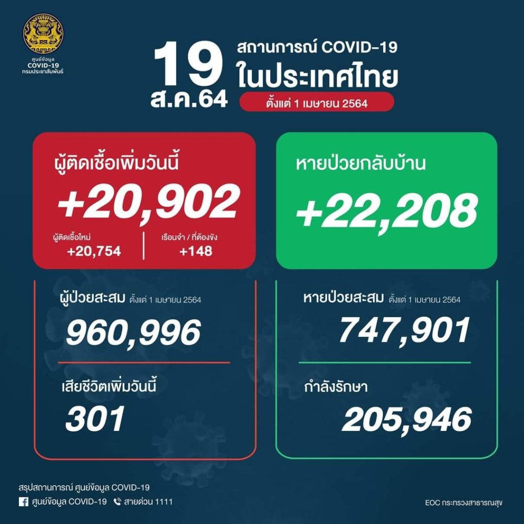 ကျန်းမာရေး၀န်ကြီးဌာန မှ ယနေ့နံနက်အတည်ပြုချက်အရထိုင်းနိုင်ငံတွင် ကိုဗစ်ကူးစက်ခံရသူ ၂၀,၉၀၂ ဦး၊ သေဆုံးသူ ၃၀၁ ဦး နှင့် ၂၂,၂၀၈ ဦး တို့ပြန်လည်သက်သာလာသည်ဟုပြောကြားသည်။