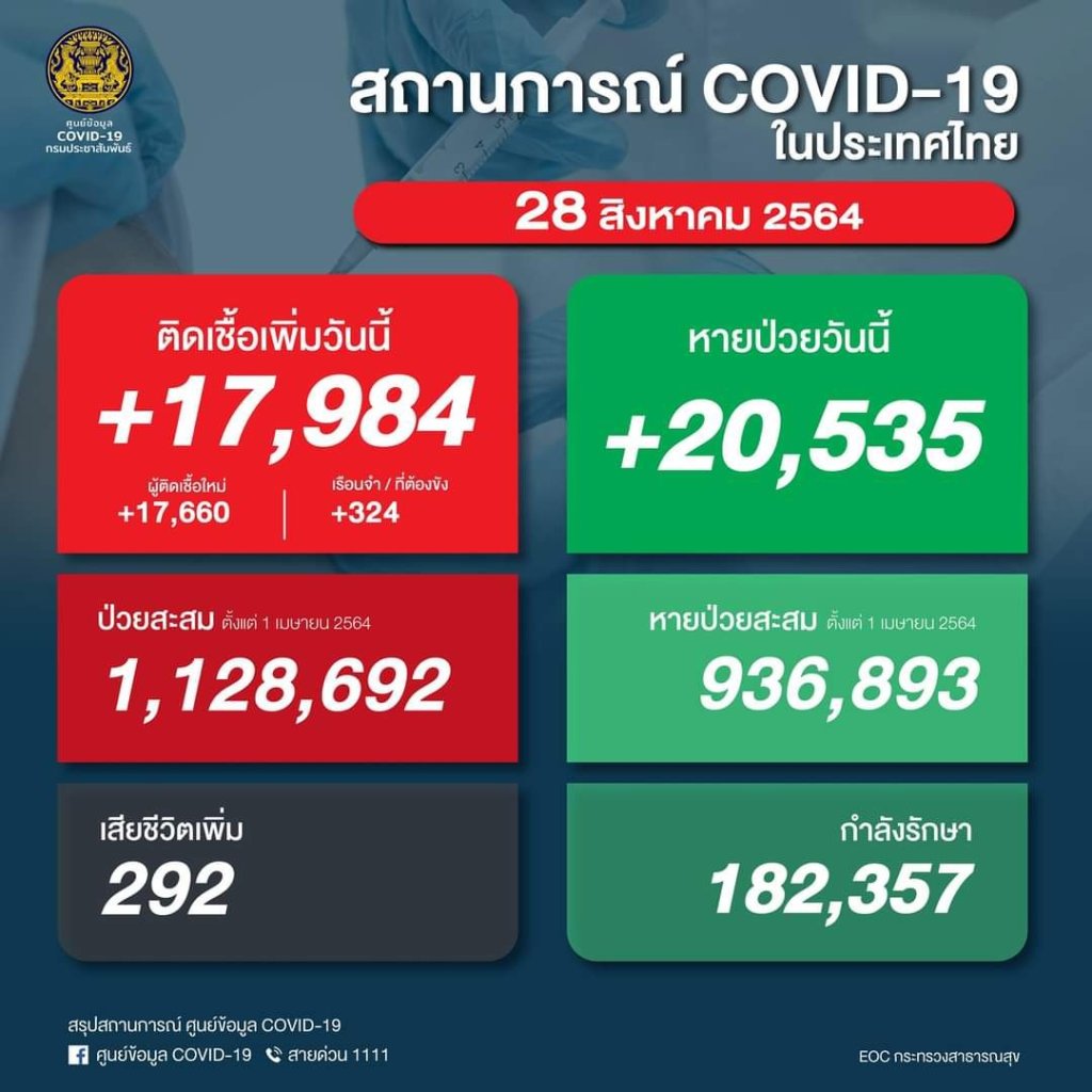 ကျန်းမာရေး၀န်ကြီးဌာန မှ ယနေ့နံနက်အတည်ပြုချက်အရထိုင်းနိုင်ငံတွင် ကိုဗစ်ကူးစက်ခံရသူ ၁၇,၉၈၄ ဦး၊ သေဆုံးသူ ၂၉၂ ဦး နှင့် ၂၀,၅၃၅ ဦး တို့ပြန်လည်သက်သာလာသည်ဟုပြောကြားသည်။