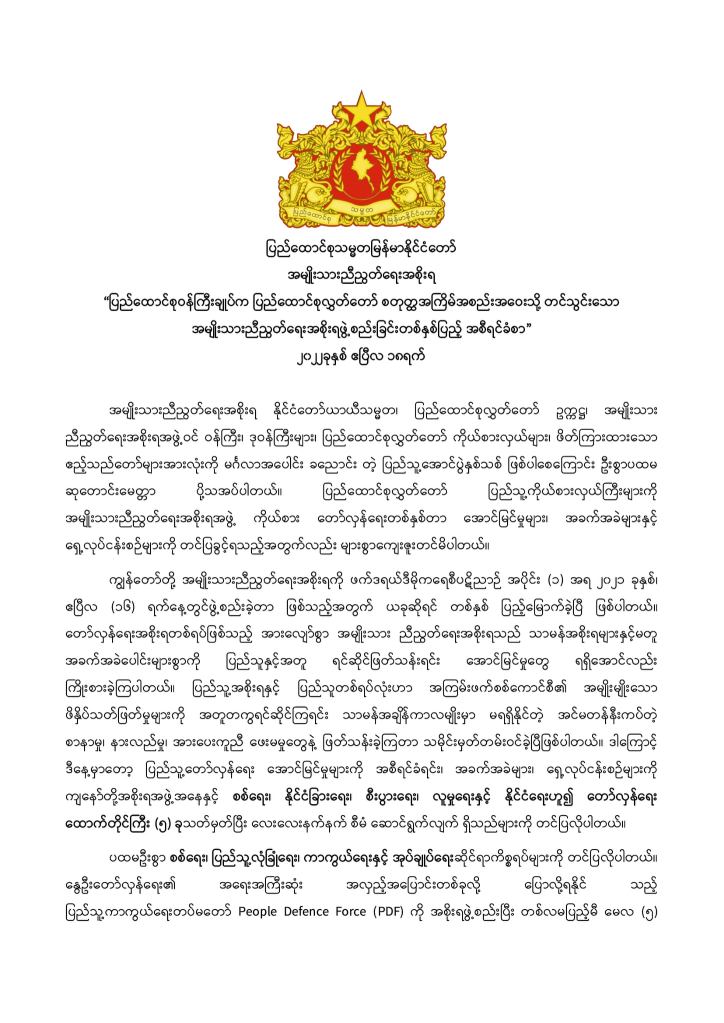 ပထမဦးစွာ စစ်ရေး၊ ပြည်သူ့လုံခြုံရေး၊ ကာကွယ်ရေးနှင့် အုပ်ချုပ်ရေးဆိုင်ရာကိစ္စရပ်များကို တင်ပြလိုပါတယ်။ နွေဦးတော်လှန်ရေး၏ အရေးအကြီးဆုံး အလှည့်အပြောင်းတစ်ခုလို့ ပြောလို့ရနိုင် သည့် ပြည်သူ့ကာကွယ်ရေးတပ်မတော် People Defence Force (PDF) ကို အစိုးရဖွဲ့စည်းပြီး တစ်လမပြည့်မီ မေလ (၅) ရက်နေ့တွင် ကာကွယ်ရေးဆိုင်ရာ မူဝါဒများနှင့်အညီ စတင်ဖွဲ့စည်း တည်ထောင်ခဲ့ပါတယ်။ စစ်တပ်၏ရာစုနှစ် တစ်ခုနီးပါးအကြာမျှ အနိုင်ကျင့်ဖိနှိပ်မှုများကို အကြမ်း မဖက်နည်းဖြင့် ဆန့်ကျင်တော်လှန်ခဲ့ကြရာမှ နောက်ဆုံးမဖြစ်မနေ မိမိကိုယ်ကိုယ် ကာကွယ်နိုင်ရေး အတွက် ခုခံကာကွယ်နိုင်ရေးနည်းလမ်းကို ရွေးချယ်ခဲ့ကြခြင်းသာ ဖြစ်ပါတယ်။ တစ်နည်းအားဖြင့် မိမိတို့၏ ဒီမိုကရေစီ၊ လူ့အခွင့်အရေးနှင့် တန်းတူညီမျှမှုတို့ကို အကြမ်းမဖက် နည်းလမ်းဖြင့် အေးချမ်းစွာ တောင်းဆိုနေသည့် ပြည်သူလူထုသည် စစ်တပ်၏ တဖက်သတ် သတ်ဖြတ်မှုများကို ကာကွယ်ရန် ဆုံးဖြတ်ခဲ့ကြခြင်းသာဖြစ်ပါတယ်။