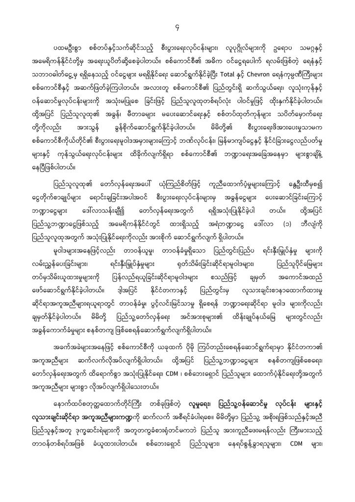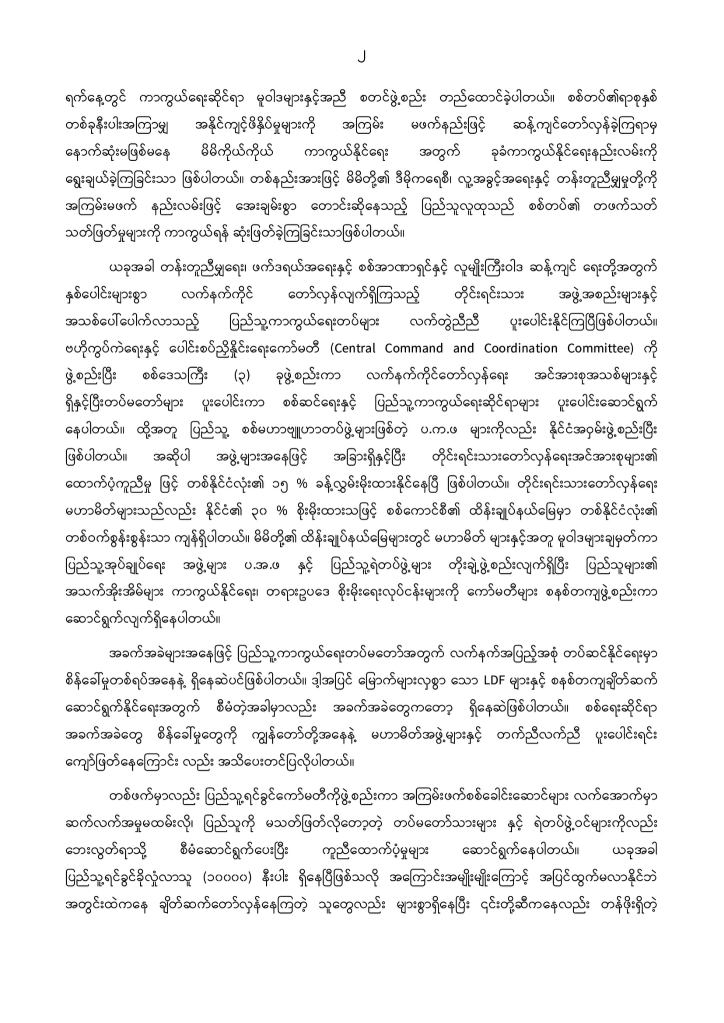 မူဝါဒများအနေဖြင့်လည်း တာဝန်ယူမှု၊ တာဝန်ခံမှုရှိသော ပြည်တွင်းပြည်ပ ရင်းနှီးမြှုပ်နှံမှု များကို လမ်းညွှန်ပေးခြင်းများ၊ ရင်းနှီးမြှုပ်နှံမှုများ ရုတ်သိမ်းခြင်းဆိုင်ရာမူဝါဒများ၊ ပြည်သူပိုင်မြေများ တပ်မှသိမ်းယူထားမှုများကို ပြန်လည်ရယူခြင်းဆိုင်ရာမူဝါဒများ စသည်ဖြင့် ချမှတ် အကောင်အထည် ဖော်ဆောင်ရွက်နိုင်ခဲ့ပါတယ်။ ဒါ့အပြင် နိုင်ငံတကာနှင့် ပြည်တွင်းမှ လူသားချင်းစာနာထောက်ထားမှု ဆိုင်ရာအကူအညီများရယူရာတွင် တာဝန်ခံမှု၊ ပွင့်လင်းမြင်သာမှု ရှိစေရန် ဘဏ္ဍာရေးဆိုင်ရာ မူဝါဒ များကိုလည်း ချမှတ်နိုင်ခဲ့ပါတယ်။ မိမိတို့ ပြည်သူ့တော်လှန်ရေး အင်အားစုများ၏ ထိန်းချုပ်နယ်မြေ များတွင်လည်း အခွန်ကောက်ခံမှုများ စနစ်တကျ ဖြစ်စေရန်ဆောက်ရွက်လျက်ရှိပါတယ်။