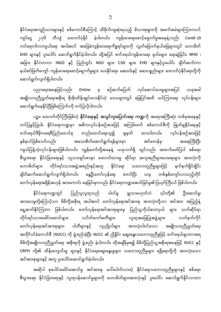 ပညာရေးအနေဖြင့်လည်း Online မှ စဉ်ဆက်မပြတ် လုပ်ဆောင်ပေးမှုများအပြင် ယခုအခါ အမျိုးသားညီညွတ်ရေးအစိုးရ စိုးမိုးထိန်းချုပ်ထားနိုင်တဲ့ ဒေသများတွင် မြေပြင်အထိ သင်ကြားရေး လုပ်ငန်းများ ဆောင်ရွက်နေနိုင်ပြီဖြစ်ကြောင်းကို တင်ပြလိုပါတယ်။
