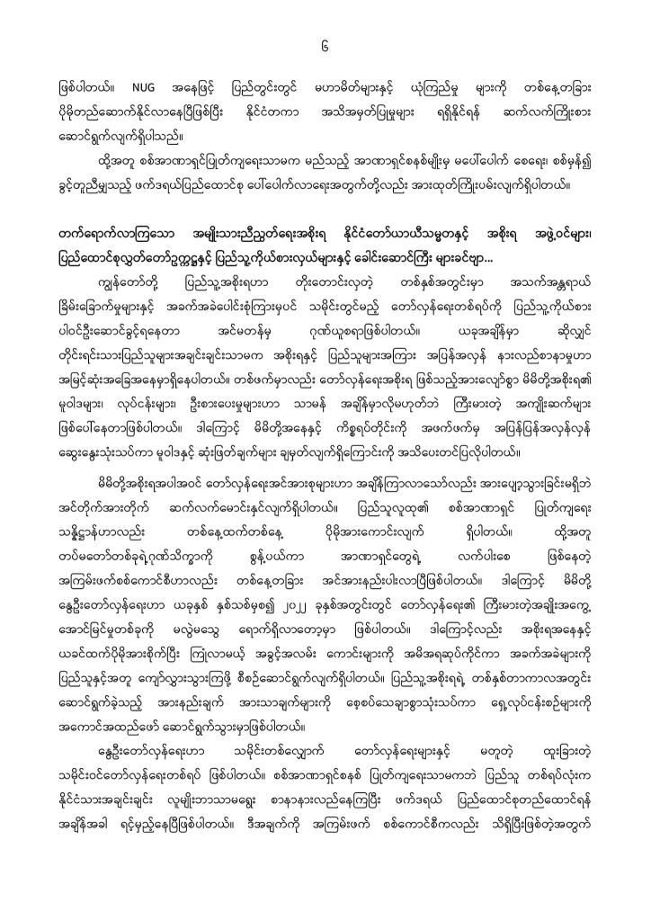 ထို့အတူ စစ်အာဏာရှင်ပြုတ်ကျရေးသာမက မည်သည့် အာဏာရှင်စနစ်မျိုးမှ မပေါ်ပေါက် စေရေး၊ စစ်မှန်၍ ခွင့်တူညီမျှသည့် ဖက်ဒရယ်ပြည်ထောင်စု ပေါ်ပေါက်လာရေးအတွက်တို့လည်း အားထုတ်ကြိုးပမ်းလျက်ရှိပါတယ်။