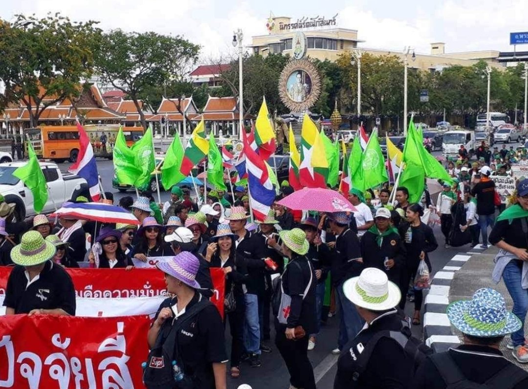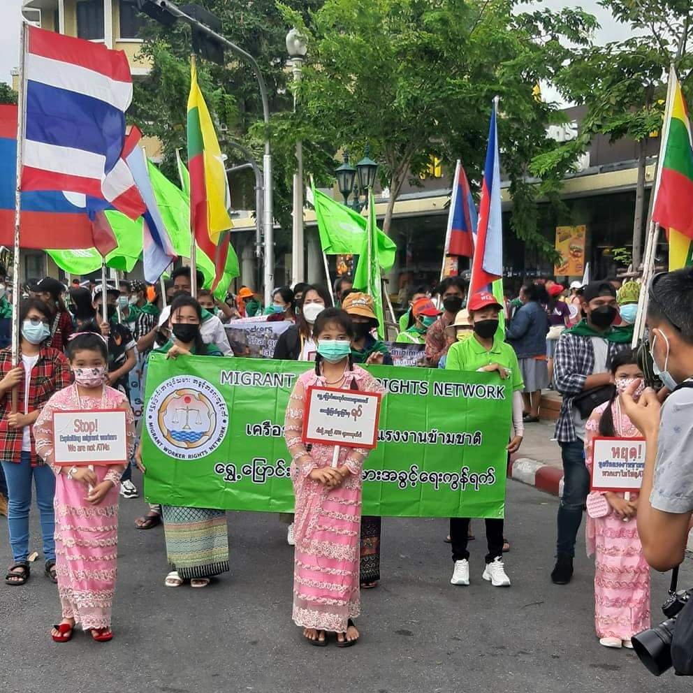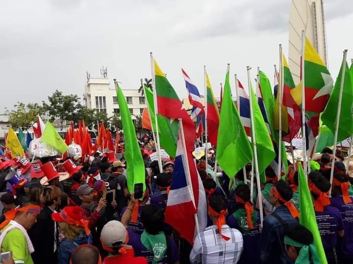 ရွှေ့ပြောင်းအလုပ်သမားအခွင့်အရေးကွန်ရက် MWRN မှ ဦးဆောင်သည့် ရွှေ့ပြောင်းအလုပ်သမားတို့သည် ထိုင်းအလုပ်သမားများ ညီညွတ်ရေးကော်မတီနှင့် နိုင်ငံပိုင်လုပ်ငန်းဆိုင်ရာ အလုပ်သမားဆက်ဆံရေး အဖွဲ့ချုပ်တို့နှင့်အတူ ဘန်ကောက်မြို့တော်ရှိ ဒီမိုကရေစီကျောက်တိုင်တွင် ဘန်ကောက်နှင့်အနီးတစ်ဝိုက်ရှိ ခရိုင်အသီးသီးက အလုပ်သမားသမဂ္ဂများတို့နှင်အတူ ထိုင်းအစိုးရအိမ်တော်ရာအထိ ချီတက်လမ်းလျှောက်ကာ တောင်းဆိုချက်များတင်ပြတောင်းဆိုခဲ့ကြသည်။
