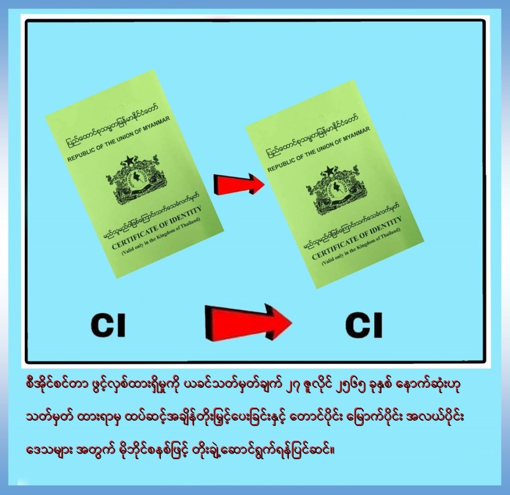 မြန်မာနိုင်ငံအစိုးရ၏ အသိအမှတ်ပြု မည်သူမည်ဝါဖြစ်ကြောင်းသက်သေခံလက်မှတ် (Certificate of Identity Cl) စာရွက်စာတမ်းများထုတ်ပေးခြင်းဆိုင်ရာကိစ္စရပ်သည် သတ်မှတ်ထားသည့် ရက်ကာလအတွင်း မပြီးပြတ်နိုင်သဖြင့် ပိုမိုထိရောက်မှုရှိစေရန်နှင့် အမြန်ဆုံး ပြီးပြတ်အောင် ဆောင်ရွက်နိုင်ဖို့ရန်အတွက် မြန်မာ ထိုင်းအစိုးရ နှစ်ဖက်သက်ဆိုင်ရာ အေဂျင်စီများတို့ ဆွေးနွေး တိုင်ပင် ကာအဖြေရှာ နိုင်ဖို့ရန်အတွက် အောက်ပါအတိုင်း အကျဉ်းချုံးနိုင်ပါသည်။