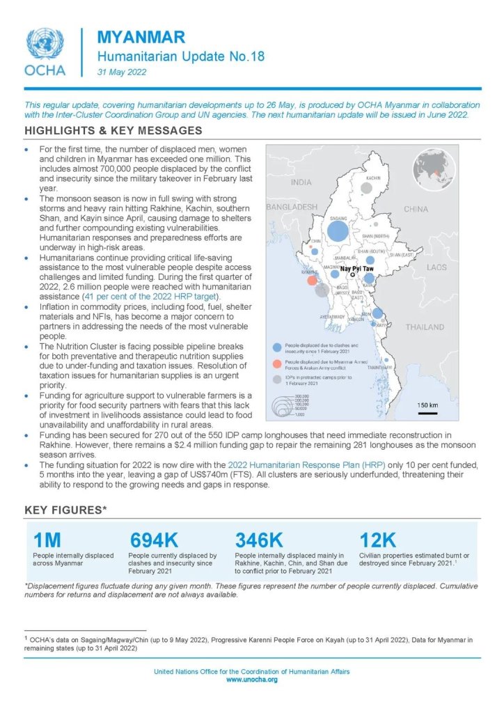 ကုလသမဂ္ဂလူသားချင်းစာနာမှုဆိုင်ရာညှိနှိုင်းရေးရုံး (OCHA)၏ ထုတ်ပြန်ချက်အရ ပထမဦးဆုံးအကြိမ်အဖြစ် မြန်မာနိုင်ငံတွင် နေရပ်စွန့်ခွာရသူအရေအတွက်သည် ၁သန်းကျော်သွားပြီ ဖြစ်သည်။ အဆိုပါအရေအတွက်တွင် ၂၀၂၁ ဖေဖော်ဝါရီ စစ်တပ်အာဏာသိမ်းမှုပြီးသည့်နောက်ပိုင်း ပဋိပက္ခနှင့် လုံခြုံရေးစိုးရိမ်ရမှုကြောင့် နေရပ်စွန့်ခွာထွက်ပြေးကြရသည့် လူဦးရေ ၇သိန်းနီးပါးလည်း ပါဝင်ပါသည်။ OCHA ၏ လူသားချင်းစာနာမှုဆိုင်ရာ အခြေအနေနှင့်ပတ်သက်သည့် နောက်ဆုံးထုတ်ပြန်ချက်အပြည့်အစုံကို https://reliefweb.int/node/3851998 တွင် ဖတ်ရှုပါ။