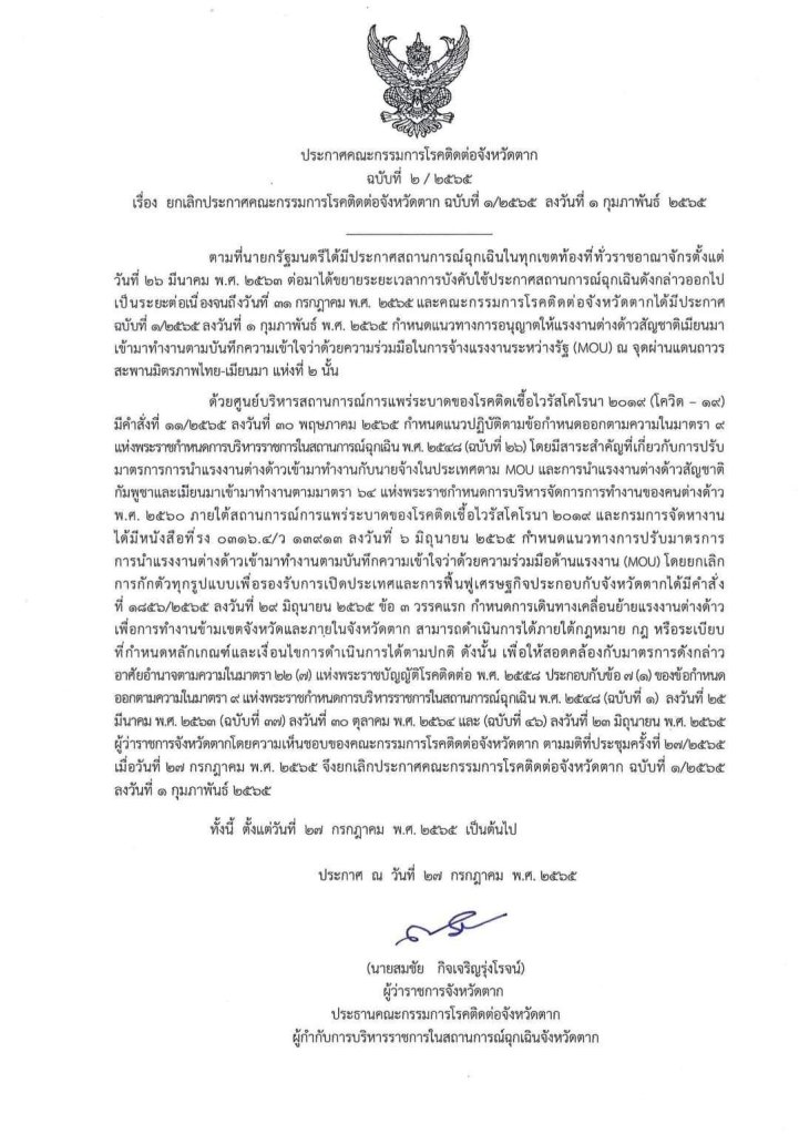 ၂၀၂၂ ခုနှစ်၊ ဖေဖော်ဝါရီလ ၉ ရက်နေ့ ရက်စွဲဖြင့် တာ့ခ်ခရိုင် ကူးစက်ရောဂါကော်မတီ၏ ကြေညာချက်အမှတ် ၁/၂၅၆၅ ကို ပရုပ်သိမ်းကြောင်းထုတ်ပြန်ကြေညာခြင်း။