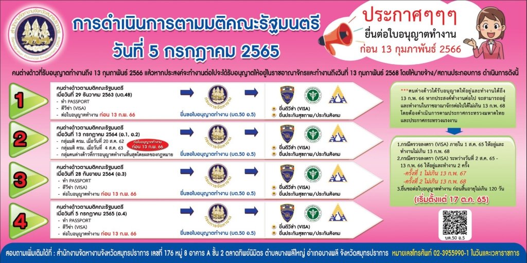ထိုင်းနိုင်ငံကို တရားမဝင် ဝင်ရောက်ပြီး အလုပ်လုပ်ကိုင်နေတဲ့ အလုပ်သမားတွေအတွက် အလုပ်လုပ်ကိုင်ခွင့်လက်မှတ် ပန်းရောင်ကဒ်(ဘတ်ကဒ်)နဲ့ CI ထိုင်းနိုင်ငံအတွင်း လွတ်လပ်စွာ နေထိုင်သွားလာခွင့် အထောက်အထား စတာတွေကို ပြုလုပ်ထားကြဖို့ ထိုင်းနိုင်ငံ အစိုးရက ကြေညာထားပါတယ်။